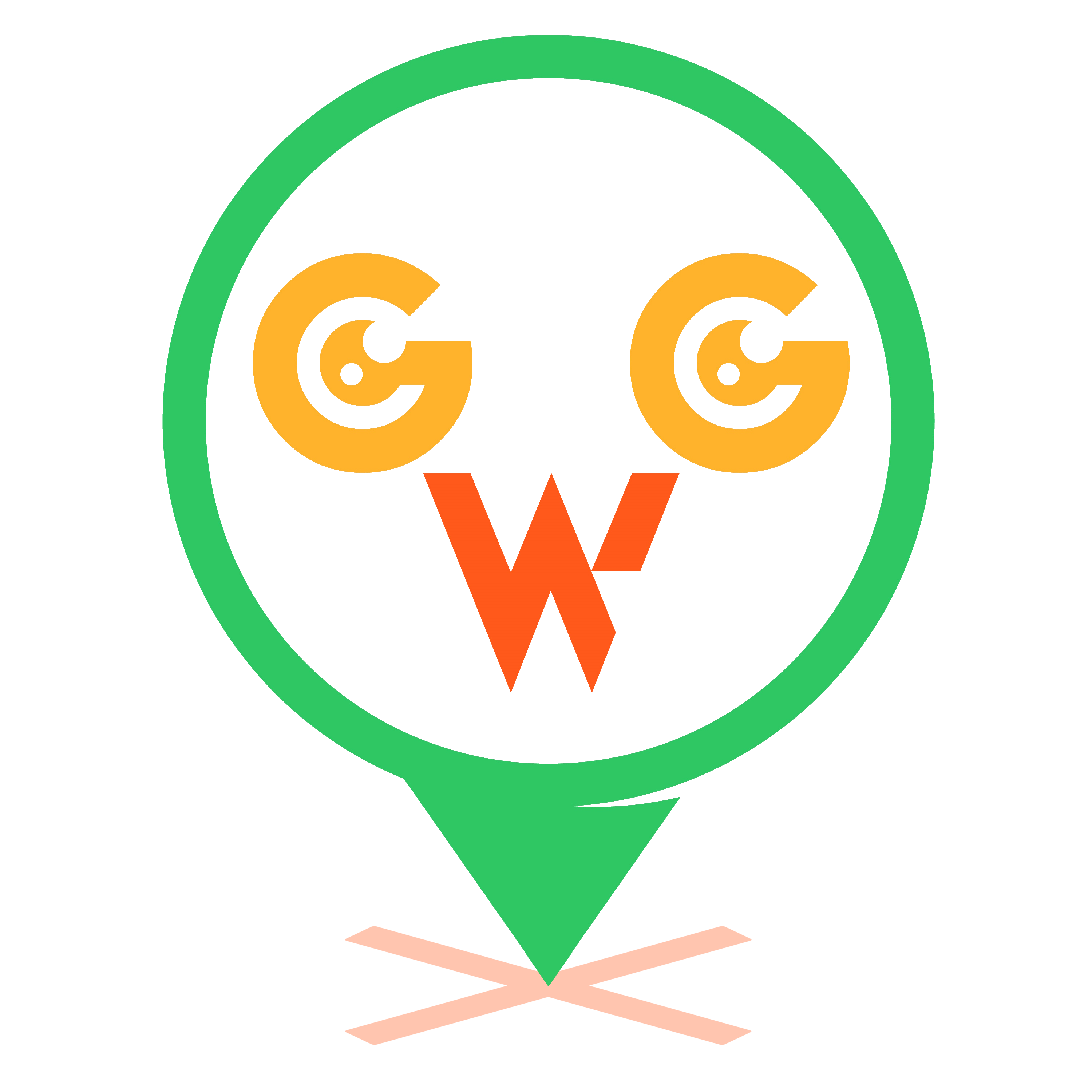 Game World Guessr Logo. A cute little map marker with G's for eye and a W for a mouth. Game World Guessr